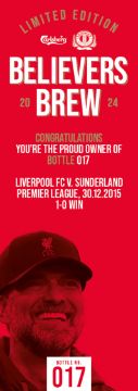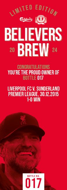 “The Believers Brew has been created by Carlsberg and ERDINGER to celebrate Jürgen Klopp’s remarkable tenure with Liverpool FC. There are a total of 491 bottles – one for every official game the iconic manager has been in charge. The bottles are numbered to reflect a specific fixture during the nine seasons of football. Carlsberg and ERDINGER have worked together every step of the way. The brew process uses two yeasts – Carlsberg yeast for the main fermentation and ERDINGER yeast for the bottle conditioning. The same goes for the raw materials; 50% ERDINGER Wheat Malt and 50% Carlsberg Pilsner Malt. And of course, the brew uses signature Red Barley. 100% of proceeds from this auction will be donated to the Liverpool FC Foundation to support the important work it does in creating life changing opportunities for the most underserved communities’ home and away. Cheers Jürgen!” Bottle No.17: Liverpool FC v. Sunderland, Premier League, 30.12.2015, 1-0 Win 75cl, 8% ABV. All bidders must be aged 18 years or older to bid and must provide photograph Id. All shipping will be made by DHL, winning bidders will be responsible for shipping costs, collection is available free of charge from our offices in Wellingborough. Winning bidders will be responsible for any Import Duties and or Custom Charges in the country of destination. The image is representative of the bottle in this lot.