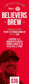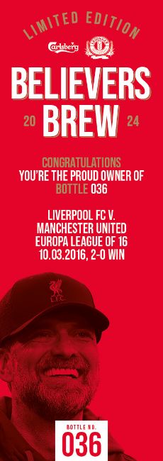 “The Believers Brew has been created by Carlsberg and ERDINGER to celebrate Jürgen Klopp’s remarkable tenure with Liverpool FC. There are a total of 491 bottles – one for every official game the iconic manager has been in charge. The bottles are numbered to reflect a specific fixture during the nine seasons of football. Carlsberg and ERDINGER have worked together every step of the way. The brew process uses two yeasts – Carlsberg yeast for the main fermentation and ERDINGER yeast for the bottle conditioning. The same goes for the raw materials; 50% ERDINGER Wheat Malt and 50% Carlsberg Pilsner Malt. And of course, the brew uses signature Red Barley. 100% of proceeds from this auction will be donated to the Liverpool FC Foundation to support the important work it does in creating life changing opportunities for the most underserved communities’ home and away. Cheers Jürgen!” Bottle No.36: Liverpool FC v. Manchester United, Europa League of 16, 10.03.2016, 2-0 Win 75cl, 8% ABV. All bidders must be aged 18 years or older to bid and must provide photograph Id. All shipping will be made by DHL, winning bidders will be responsible for shipping costs, collection is available free of charge from our offices in Wellingborough. Winning bidders will be responsible for any Import Duties and or Custom Charges in the country of destination. The image is representative of the bottle in this lot.