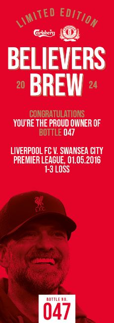“The Believers Brew has been created by Carlsberg and ERDINGER to celebrate Jürgen Klopp’s remarkable tenure with Liverpool FC. There are a total of 491 bottles – one for every official game the iconic manager has been in charge. The bottles are numbered to reflect a specific fixture during the nine seasons of football. Carlsberg and ERDINGER have worked together every step of the way. The brew process uses two yeasts – Carlsberg yeast for the main fermentation and ERDINGER yeast for the bottle conditioning. The same goes for the raw materials; 50% ERDINGER Wheat Malt and 50% Carlsberg Pilsner Malt. And of course, the brew uses signature Red Barley. 100% of proceeds from this auction will be donated to the Liverpool FC Foundation to support the important work it does in creating life changing opportunities for the most underserved communities’ home and away. Cheers Jürgen!” Bottle No.47: Liverpool FC v. Swansea City, Premier League, 01.05.2016, 1-3 Loss 75cl, 8% ABV. All bidders must be aged 18 years or older to bid and must provide photograph Id. All shipping will be made by DHL, winning bidders will be responsible for shipping costs, collection is available free of charge from our offices in Wellingborough. Winning bidders will be responsible for any Import Duties and or Custom Charges in the country of destination. The image is representative of the bottle in this lot.