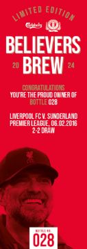 “The Believers Brew has been created by Carlsberg and ERDINGER to celebrate Jürgen Klopp’s remarkable tenure with Liverpool FC. There are a total of 491 bottles – one for every official game the iconic manager has been in charge. The bottles are numbered to reflect a specific fixture during the nine seasons of football. Carlsberg and ERDINGER have worked together every step of the way. The brew process uses two yeasts – Carlsberg yeast for the main fermentation and ERDINGER yeast for the bottle conditioning. The same goes for the raw materials; 50% ERDINGER Wheat Malt and 50% Carlsberg Pilsner Malt. And of course, the brew uses signature Red Barley. 100% of proceeds from this auction will be donated to the Liverpool FC Foundation to support the important work it does in creating life changing opportunities for the most underserved communities’ home and away. Cheers Jürgen!” Bottle No.28: Liverpool FC v. Sunderland, Premier League, 06.02.2016, 2-2 Draw 75cl, 8% ABV. All bidders must be aged 18 years or older to bid and must provide photograph Id. All shipping will be made by DHL, winning bidders will be responsible for shipping costs, collection is available free of charge from our offices in Wellingborough. Winning bidders will be responsible for any Import Duties and or Custom Charges in the country of destination. The image is representative of the bottle in this lot.