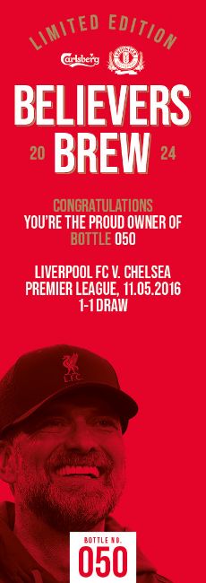 “The Believers Brew has been created by Carlsberg and ERDINGER to celebrate Jürgen Klopp’s remarkable tenure with Liverpool FC. There are a total of 491 bottles – one for every official game the iconic manager has been in charge. The bottles are numbered to reflect a specific fixture during the nine seasons of football. Carlsberg and ERDINGER have worked together every step of the way. The brew process uses two yeasts – Carlsberg yeast for the main fermentation and ERDINGER yeast for the bottle conditioning. The same goes for the raw materials; 50% ERDINGER Wheat Malt and 50% Carlsberg Pilsner Malt. And of course, the brew uses signature Red Barley. 100% of proceeds from this auction will be donated to the Liverpool FC Foundation to support the important work it does in creating life changing opportunities for the most underserved communities’ home and away. Cheers Jürgen!” Bottle No.50: Liverpool FC v. Chelsea, Premier League, 11.05.2016, 1-1 Draw 75cl, 8% ABV. All bidders must be aged 18 years or older to bid and must provide photograph Id. All shipping will be made by DHL, winning bidders will be responsible for shipping costs, collection is available free of charge from our offices in Wellingborough. Winning bidders will be responsible for any Import Duties and or Custom Charges in the country of destination. The image is representative of the bottle in this lot.