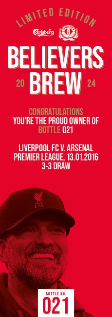 “The Believers Brew has been created by Carlsberg and ERDINGER to celebrate Jürgen Klopp’s remarkable tenure with Liverpool FC. There are a total of 491 bottles – one for every official game the iconic manager has been in charge. The bottles are numbered to reflect a specific fixture during the nine seasons of football. Carlsberg and ERDINGER have worked together every step of the way. The brew process uses two yeasts – Carlsberg yeast for the main fermentation and ERDINGER yeast for the bottle conditioning. The same goes for the raw materials; 50% ERDINGER Wheat Malt and 50% Carlsberg Pilsner Malt. And of course, the brew uses signature Red Barley. 100% of proceeds from this auction will be donated to the Liverpool FC Foundation to support the important work it does in creating life changing opportunities for the most underserved communities’ home and away. Cheers Jürgen!” Bottle No.21: Liverpool FC v. Arsenal, Premier League, 13.01.2016, 3-3 Draw 75cl, 8% ABV. All bidders must be aged 18 years or older to bid and must provide photograph Id. All shipping will be made by DHL, winning bidders will be responsible for shipping costs, collection is available free of charge from our offices in Wellingborough. Winning bidders will be responsible for any Import Duties and or Custom Charges in the country of destination. The image is representative of the bottle in this lot.