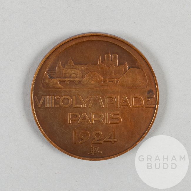 1924 Paris Olympic Games bronze participation medal, designed by Raoul Bernard, bronze, the obverse with city view of Paris above and inscribed VIII OLYMPIADE PARIS 1924, reverse with figure of Victory crowning victorious athletes with laurel wreaths, the rim inscribed bronze, 55mm.