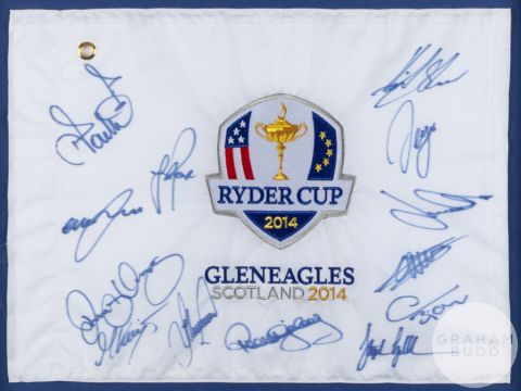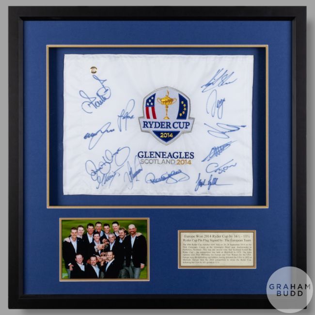 A flag from the 2014 Ryder Cup held at Gleneagles from the 26th to the 28th of September, signed by the European team with a colour photographic print insert of the winners and competition resume, framed and glazed, measuring 28.5 x 28 ins.