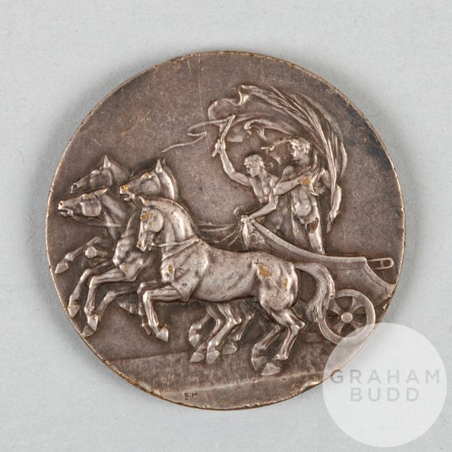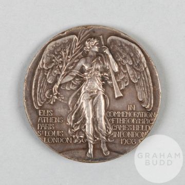 London 1908 Olympic Games white-metal participant's medal, designed by Bertram MacKennal, the obverse depicting a Greek four-horsed chariot with the driver and judge, the reverse depicting the winged figure of Fame standing on a globe inscribed ELIS, ATHENS, APRIS, ST LOUIS, LONDON, IN COMMEMORATION OF THE OLYMPIC GAMES HELD IN LONDON 1908, 50mm., weight 46gms., bears some wear to rim edge