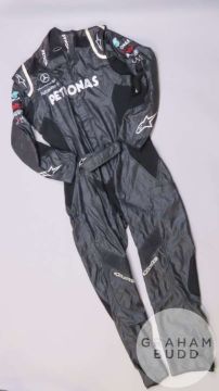 Black Mercedes pit crew suit by Alpinestars, with interior label MGP-Crew 27-11, size 58 Euro, with sponsors logo.
