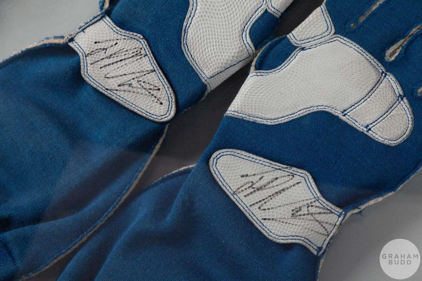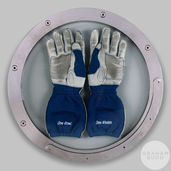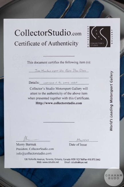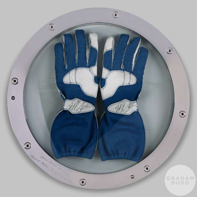 Juan Pablo Montoya pair of blue and white Alpine Stars race worn gloves, USA Grand Prix 2002, both gloves autographed, the right glove inscribed One Goal, the other One Vision, with COA from Collector Studio in bespoke stainless steel and glass frame, frame inscribed Juan Pablo Montoya, United States Grand Prix, 49cm. diameter.
