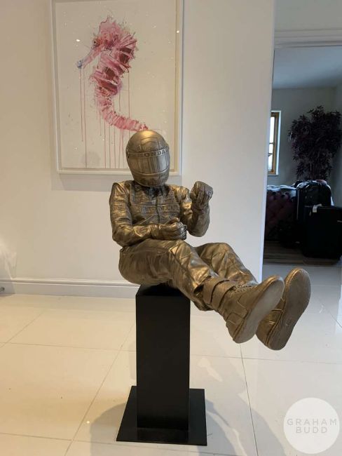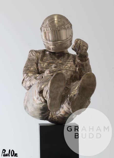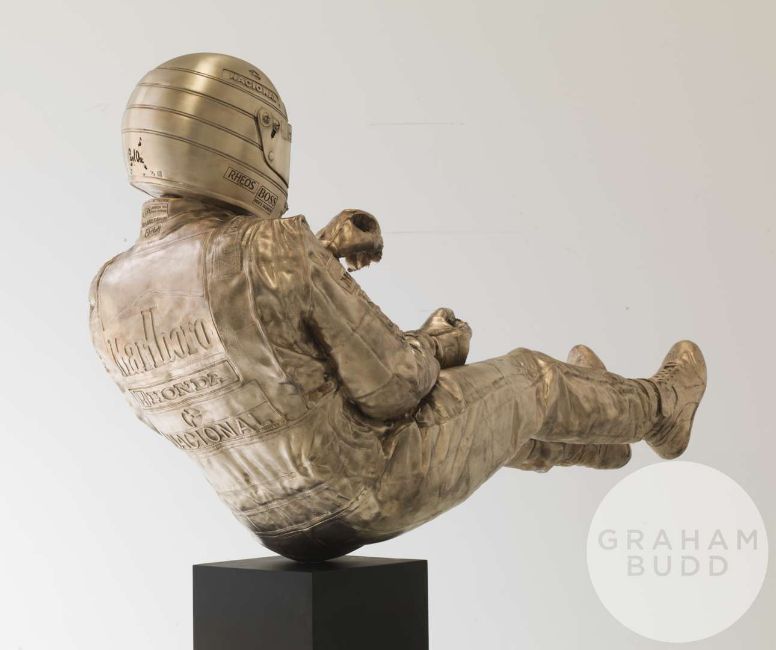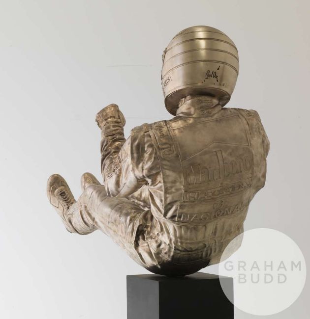 Senna ‘Eau Rouge’ bronze by Paul Oz, an identical 60% scale version of the life-size statue that stands next to Ayrton Senna’s car on McLaren’s MTC Boulevard. One of an edition of 41 marking Senna’s F1 race victory tally, 105 x 108 x 46cm., 35kg. bronze.