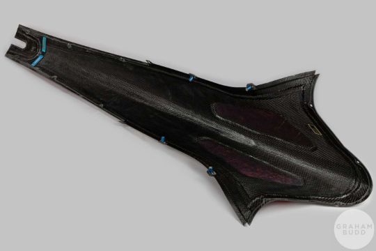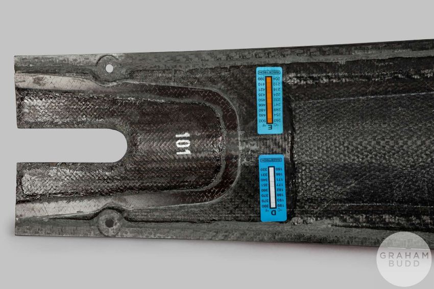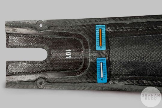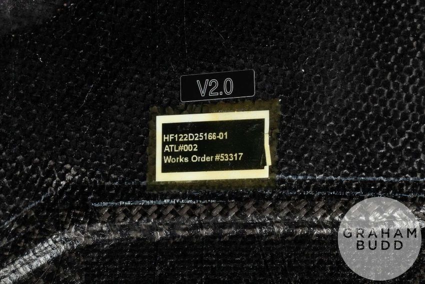 An official Haas F1 2022 engine cover with HaasTooling.com decal, the underside with stencil number 101, and with V2.0 and HF122D25166-01 ATL#002 Works Order #53317 sticker and with two Racetech E and D thermometers, approx. 152cm. long.