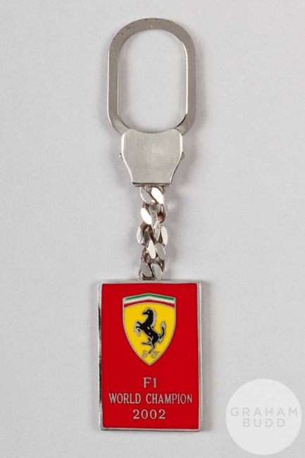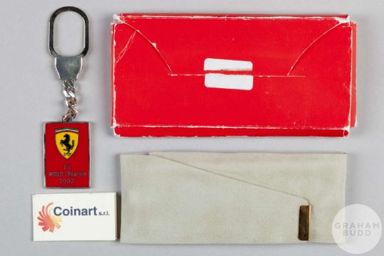 Rare continental silver and enamel Ferrari 2002 world championship commemorative keyring, to celebrate Michael Schumacher winning his fifth World Title, the obverse inscribed F1 WORLD CHAMPION 2002, the reverse with applied signatures of Luca Montezemolo, Jean Todt, Michael Schumacher and Rubens Barichello, with original wallet and box, the key ring was given by Ferrari to a very small group of guests at a dinner held at the 2002 Grand Prix.