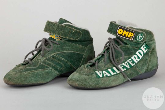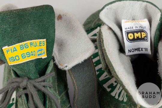 Johnny Herbert a pair of OMP FIA green 2000 season race worn boots, with embroidered VALVERDERE decals on the sides and OMP lettering on the Velcro fastening strap.
