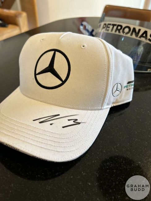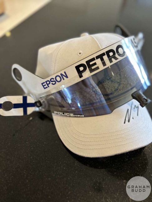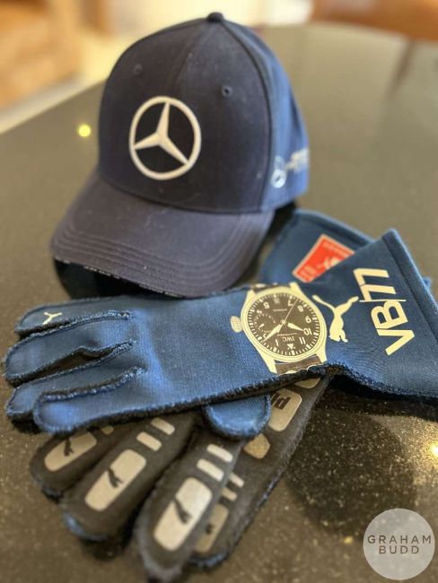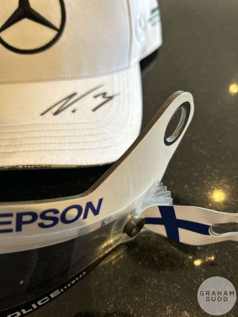 Valtteri Bottas Mercedes F1 memorabilia, race used visor with Finnish flag and tear off strips, pair of race used gloves with FIA hologram, signed cap, unsigned cap, (4).