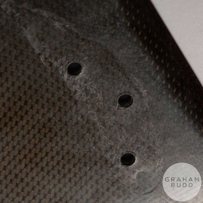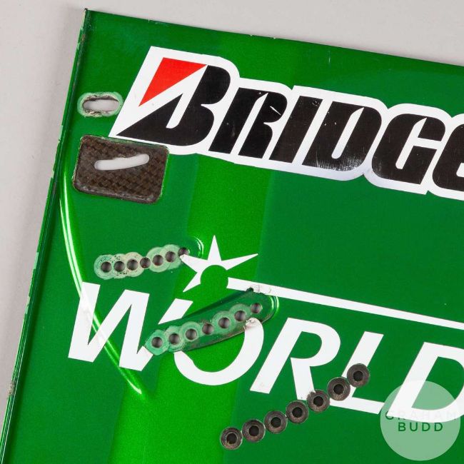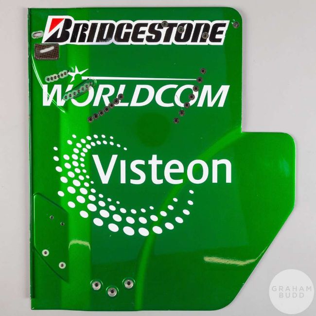 A Jaguar F1 rear wing end plate, 2008, with Bridgestone, Worldcom, Visteon sponsors decals, 50cm. high.