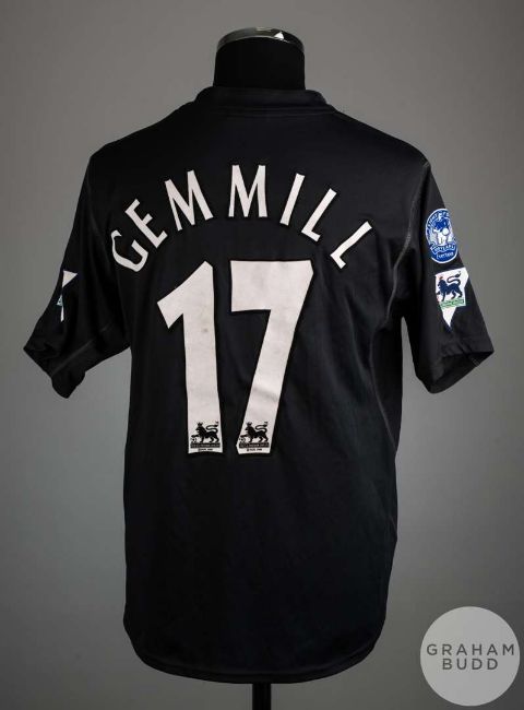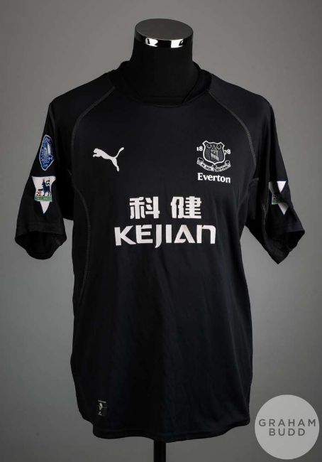 Scott Gemmill black No.17 Everton short-sleeved shirt, 2002-03, Puma, L, with crew-neck collar and embroidered badge inscribed 1878 EVERTON, the reverse lettered GEMMILL, the sleeves with The F.A. Premier league flashes and the right sleeve with further TOP FLIGHT FOOTBALL 100 YEARS Everton