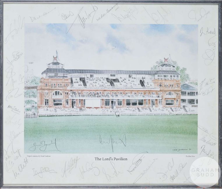 David Gentleman “The Lord’s Pavilion” autographed colour print, the mount bearing thirty-two cricketers autographs, including Geoff Boycott, David Gower, John Crawley, Alan Knott, etc., 45 x 52cm overall, framed and glazed All glass will be removed from framed and glazed items prior to posting and may result in delays to shipping your items. (This service is included in the cost of postage and packing). We can also totally remove all framing and mounts upon request to reduce shipping costs. Alternatively lots can be collected in person by prior appointment from NN8 1RT.