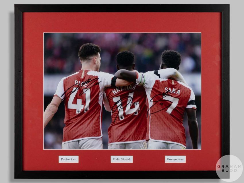 Declan Rice, Eddie Nketiah and Bukayo Saka triple-signed Arsenal photograph, 12 by 16in. colour photograph featuring the three players walking away from the camera position following an Arsenal goal, all signatures in black marker, mounted above printed name legends, framed & glazed, 44 by 54cm.