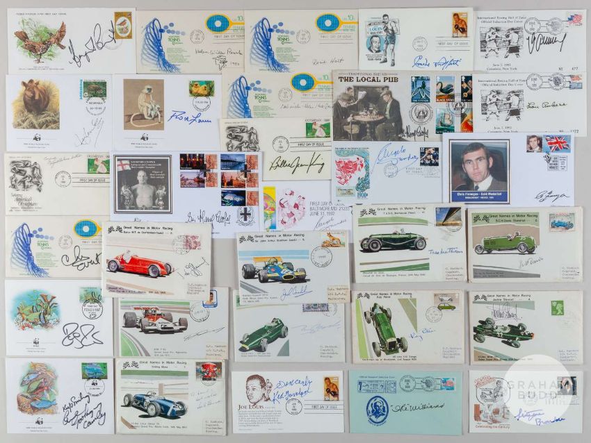 A collection of autographed boxing first day covers including Max Schmelling, Angelo Dundee, Henry Cooper, Ken Norton, etc small collection of tennis including Rod Laver, Margaret Court, Helen Wills Moody, Roger Federer, Billy Jean King etc and a collection of motor racing examples including Jackie Stewart etc