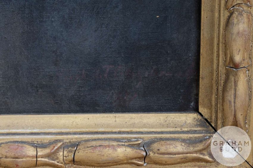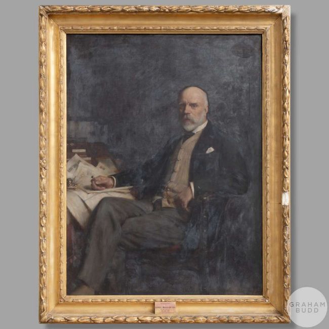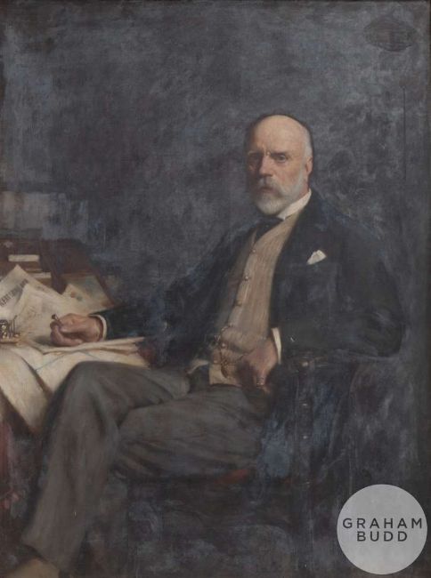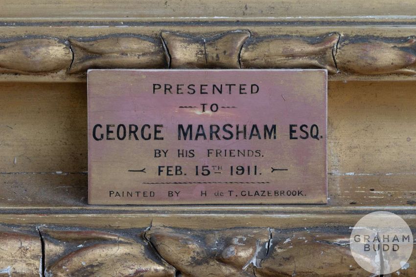Hugh De Twenebrokes Glazebrook (British, 1870-1935) Portrait of George Marsham seated with cricket inkwell, signed lower right and inscribed on the canvas verso Portrait of George Marsham Esq, 1911 the frame with dedication plaque inscribed Presented to George Marsham Esq by his friends FEB. 15th 1911, painted by H De T. Glazebroook, canvas 148 x 110cm. with frame 170 x 137cm., holed in three places vertically across, right hand, arm George Marsham was an English landowner and amateur cricketer who was connected with Kent County Cricket Club. The son of George F. J. Marsham who was the rector of the parish He came from a cricketing family: his nephew, C. H. B. Marsham, captained Kent between 1904 and 1908 and was captain when the county won its first County Championship in 1906,  and his brothers-in-law Charles, Robert and Cloudesley all played first-class cricket Marsham was one of seven siblings and the only son to survive infancy. Educated at Eton College, where he played some cricket, and Merton College, Oxford where he matriculated in 1867, Marsham played three first-class matches for Kent between 1877 and 1878. He was President of the club in 1886 and was also a prominent member of I Zingari, Band of Brothers and the Old Stagers.ARR charges may be applicable.