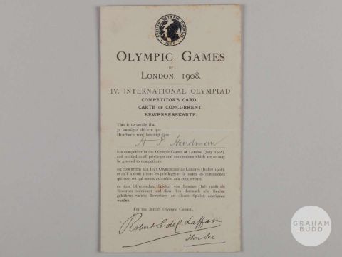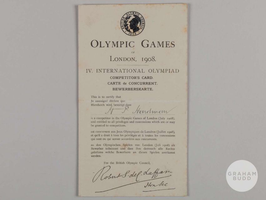Football Olympics 1908 London HP Hardman very rare officials and competitors card, modern day accreditation pass. Hardman was a member of the Great Britain team who won the gold medal beating Denmark 2-0. He played for Blackpool, Everton and Manchester United and others and internationally with England, England Amateurs and Great Britain, bears horizontal fold, signed in black ink, slight foxing and yellowingProvenance: collected by the vendor in the 1980's.