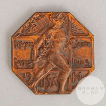 1904 St Louis Olympic Games an extremely rare athlete’s participation medal, by Dieges & Clust, New York, without any traces of loop at top edge, as presented to the athletes, the obverse with a naked athlete and inscribed OLYMPIC GAMES SAINT LOUIS 1904 USA, the reverse inscribed 1803 Universal Exposition Commemorating The OLYMPIC GAMES 1904, PHYSICAL CULTURE DEPARTMENT, Frederick J. V. Skiff, Director of EXHIBITS and the shields of St Louis, France & USA on a background of ivy leaves, 40mm. The present medal has no loop, or traces of a loop being removed, and therefore was originally presented to a participating athlete.