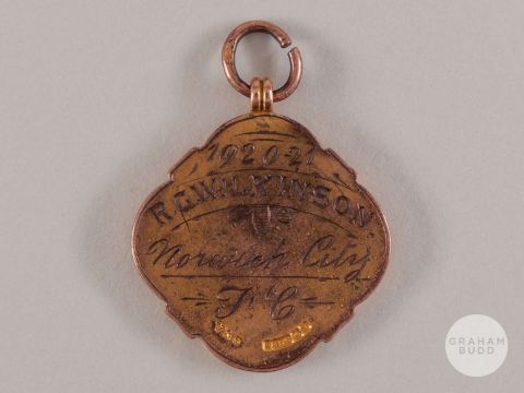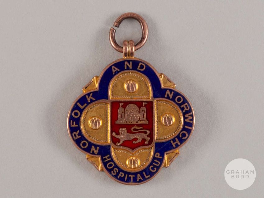 Reginald Wilkinson 9ct gold and enamel Norfolk and Norwich Hospital Cup medal, 1920-21, the obverse inscribed NORFOLK AND NORWICH HOSPITAL CUP, the reverse inscribed 1920-21 R.G. WILKINSON, Norwich City FC.In the final against South Shields, the match ended in a 0-0 draw.Provenance: Knights Auction, June 2003.The following lots 15 to 18 relate to the career of Reg Wilkinson.
