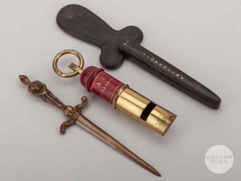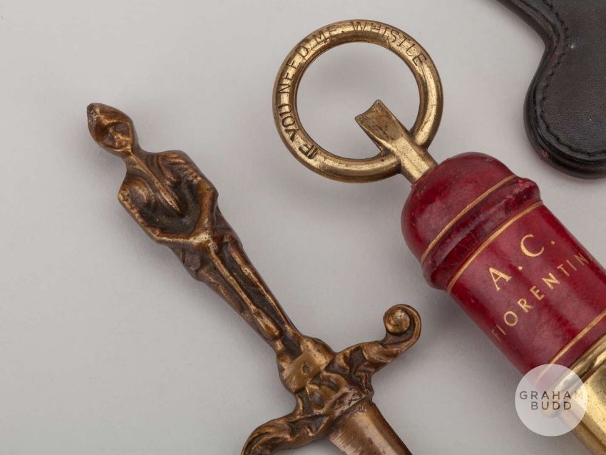 David Sadler two Anglo-Italian Cup gifts, 1973, comprising large whistle and letter opener inscribed A.C. Fiorentina, (2).In the Anglo-Italian Cup match played 14th February 1973 at Old Trafford, the teams drew the match 0-0.
