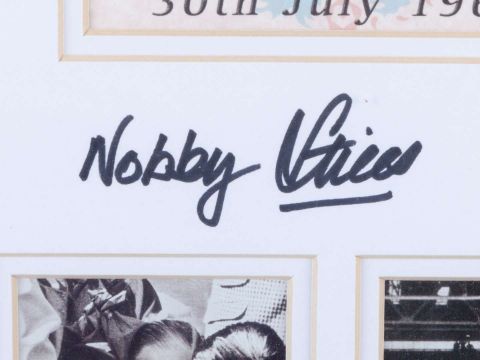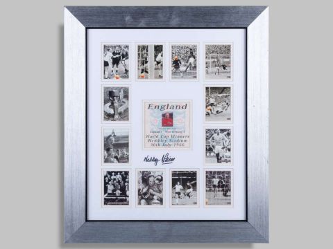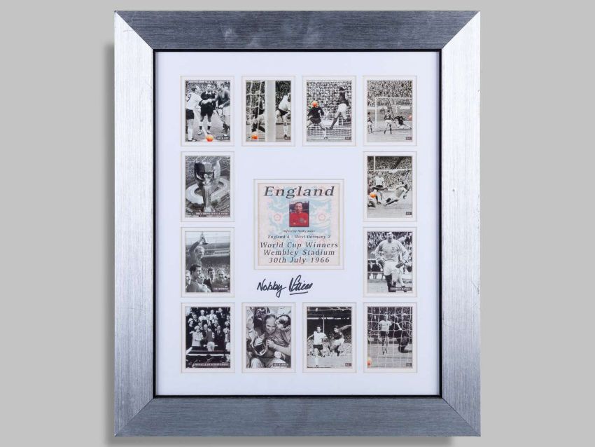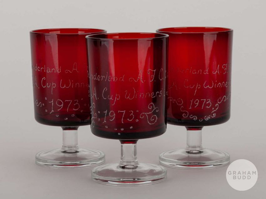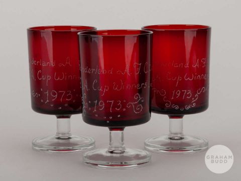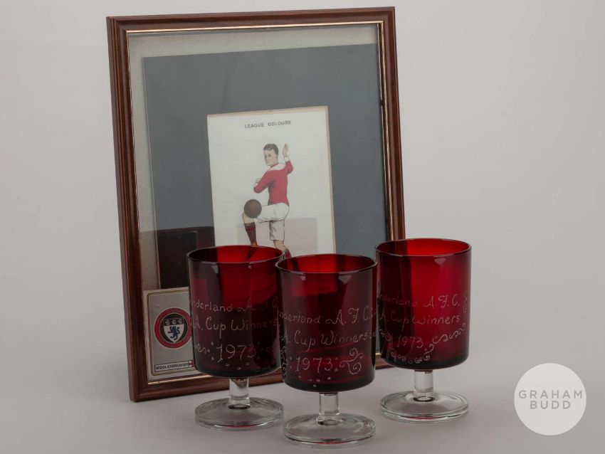 A Middlesbrough large silk cigarette card by BDV Cigarettes, three Sunderland 1973 F.A.Cup Winners cranberry-coloured glasses and a modern 1966 World Cup montage signed by Nobby Stiles