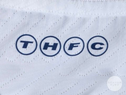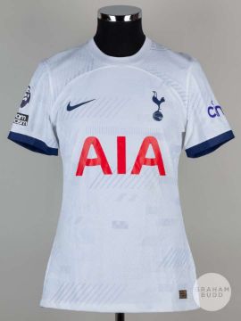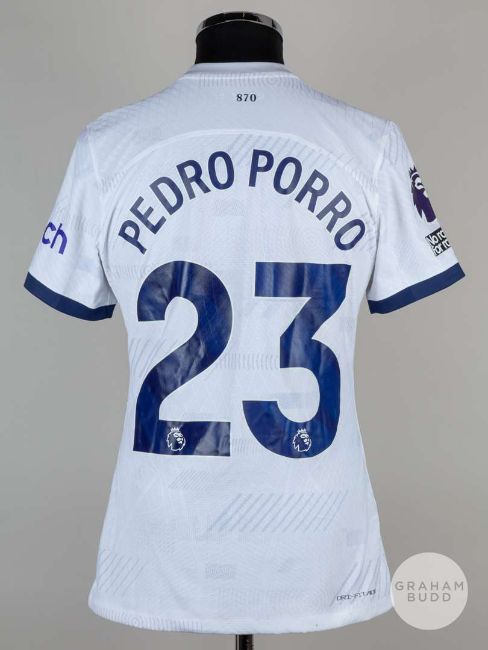 Pedro Porro white No.23 Tottenham Hotspur short-sleeved shirt, 2023-24, Nike, M, with crew-neck collar and printed badge, the reverse lettered PEDRO PORRO, the right sleeve with Premier League flash, pitch stains