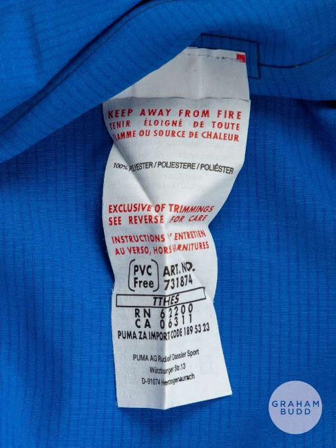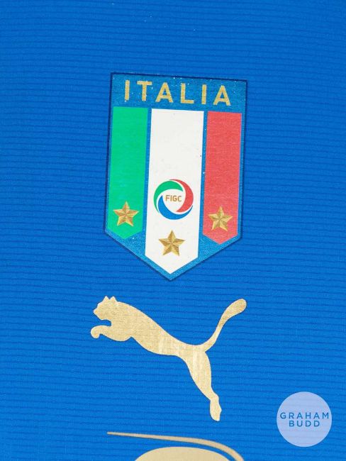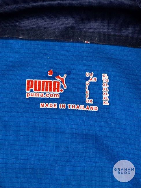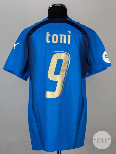 Luca Toni blue & navy Italy No.9 shirt, Puma, size XL, short-sleeved with country emblem, right sleeve bearing FIFA WORLD CUP GERMANY 2006 badge, reverse lettered TONI