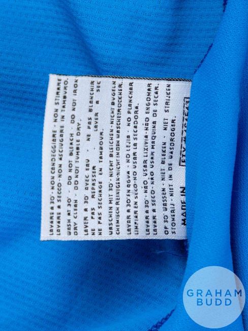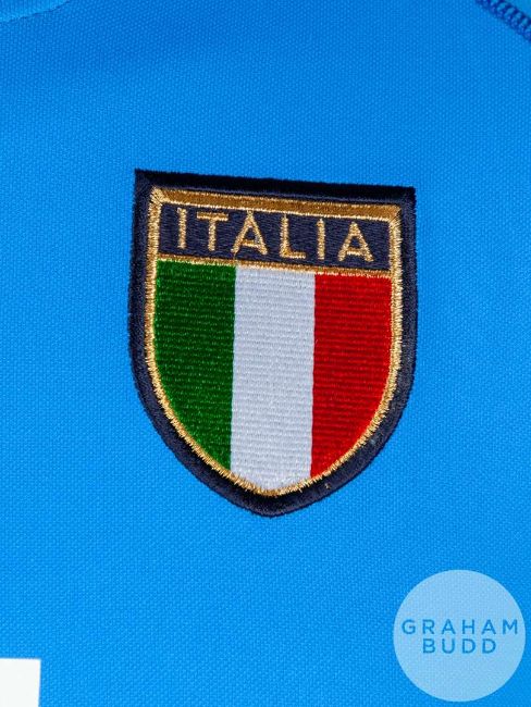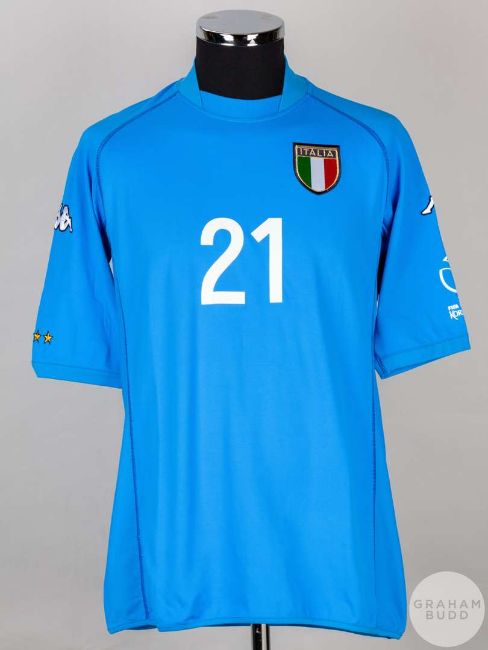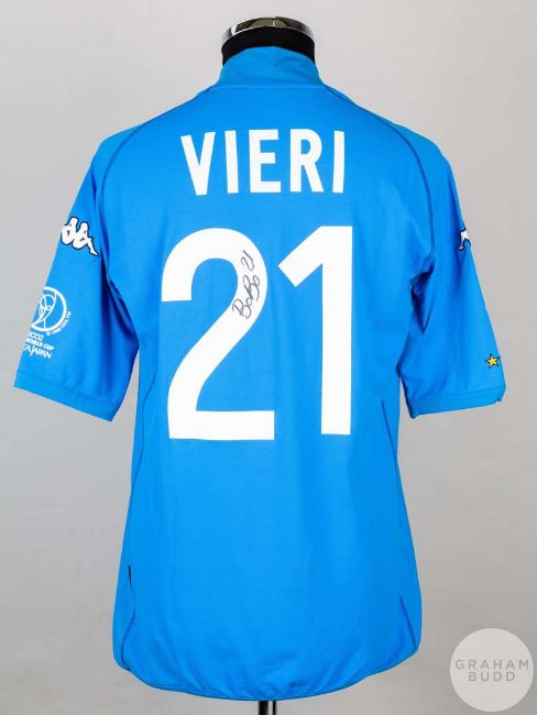 Christian Vieri blue No.21 Italy short sleeved replica shirt 2011/12 , Kappa, crew neck collar, embroidered badge, reverse lettered VIERI with the 2002 FIFA World Cup Korean Japan flash on the left sleeve and signed in black pen on the reverse No.2.Believed to have been worn in the game v Croatia which took place in Ibaraki on 8/8/02.