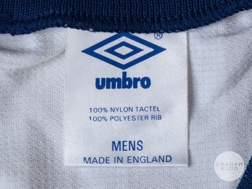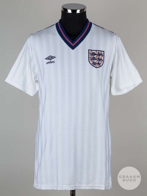 Viv Anderson white No.12 England match issued short-sleeved shirt, 1986, Mens, with v-neck collar and embroidered three lion badgeThe above shirt was issued to Viv for the pre 1986 World Cup warm-up matchesProvenance: The Viv Anderson CollectionThe following lots 39 to 159 relate to the career of Viv Anderson MBE. See bio foot of lot 39