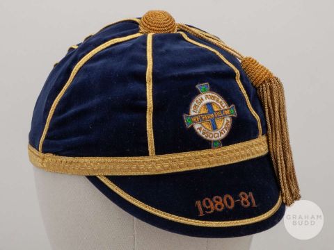 David McCreery dark blue Northern Ireland cap, 1980-81 embroidered badge, gold tassel and trim, representing the games played against Sweden (x2), Portugal (x2) and Scotland, representing his 31st to 35th appearancesThe following lots 288 to 359 relate to the career of David McCreery. See bio foot of lot 288.