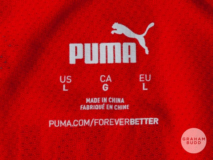 Matthis Abline red No.18 Stade Rennais short-sleeved shirt, 2021-22, Puma, L, with v-neck style and printed bade, the reverse lettered ABLINE, the right sleeve with Europa League Conference League flash and the other with UEFA Foundation flash