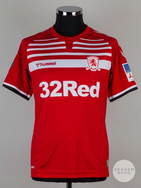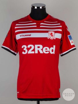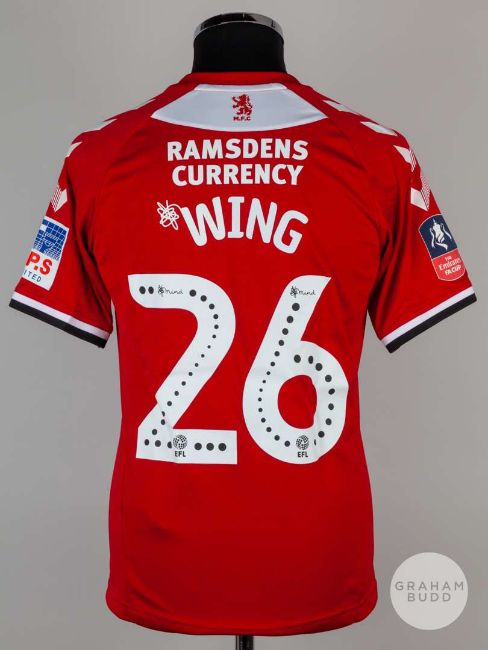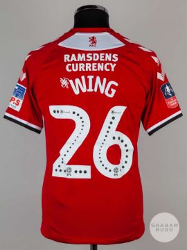 Lewis Wing red No.26 Middlesbrough short-sleeved shirt, 2019-20, Hummel, S, with crew-neck collar and printed badge, the reverse lettered WING, the right sleeve with THE Emirates FA CUP flash