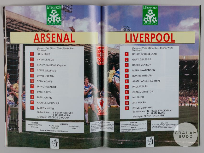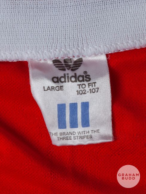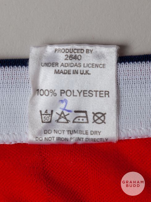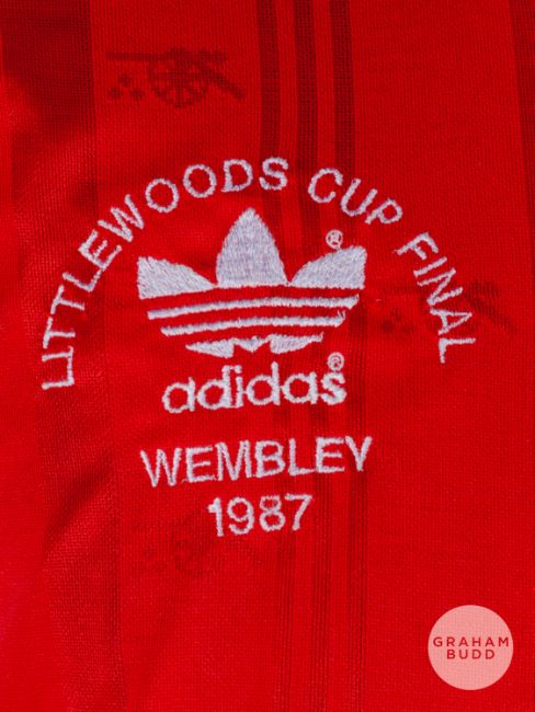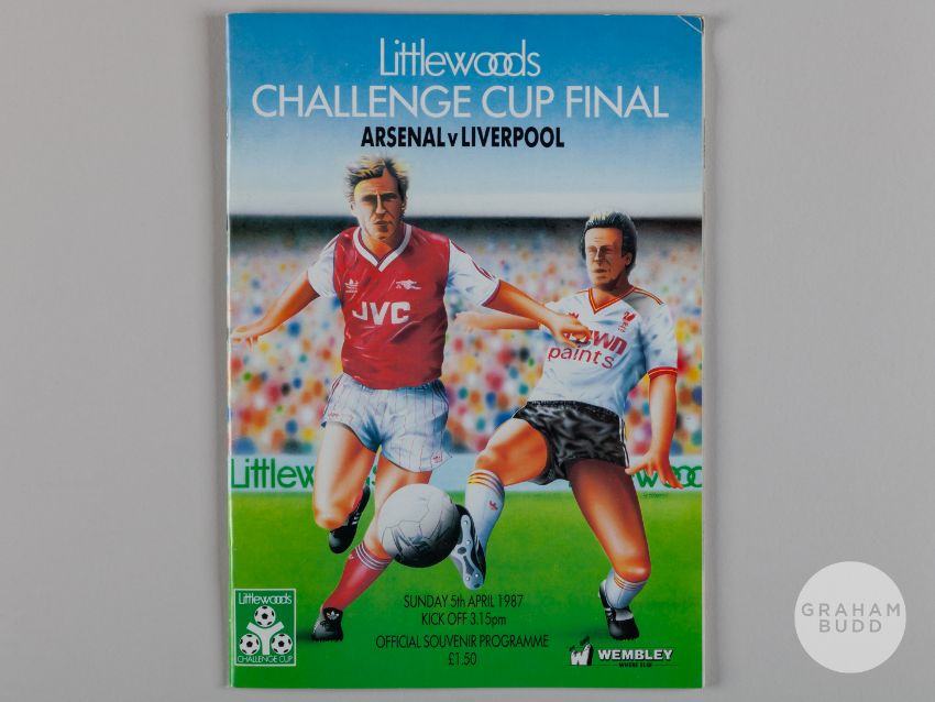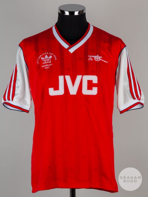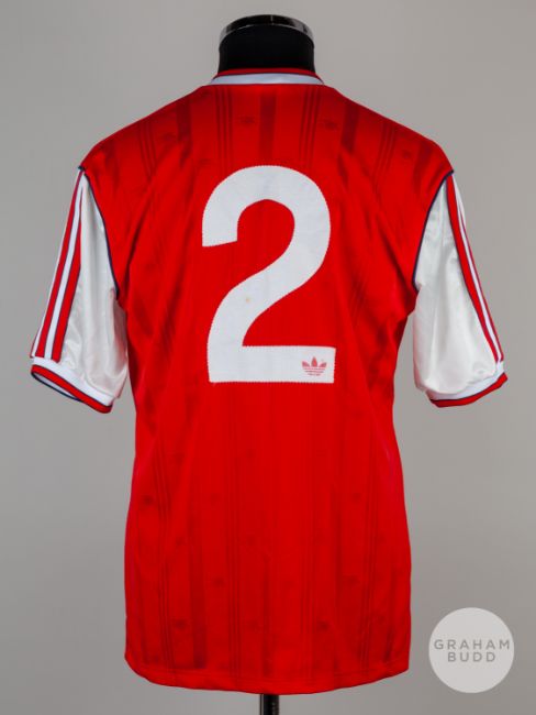 Viv Anderson red and white No.2 Arsenal v. Liverpool match worn Littlewoods Cup Final short-sleeved shirt, 1987, Arsenal, L, with v-neck collar and embroidered badge inscribed AFC, LITTLEWOODS CUP FINAL, WEMBLEY 1987, with match programme (2)The above shirt was worn by Viv in the 1987 Littlewoods Cup Final played on 5th April 1987 at Wembley, Arsenal defeating Liverpool 2-1Provenance: The Viv Anderson CollectionThe following lots 39 to 159 relate to the career of Viv Anderson MBE. See bio foot of lot 39