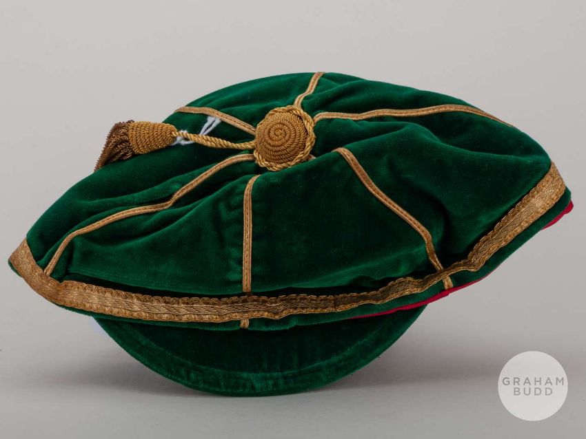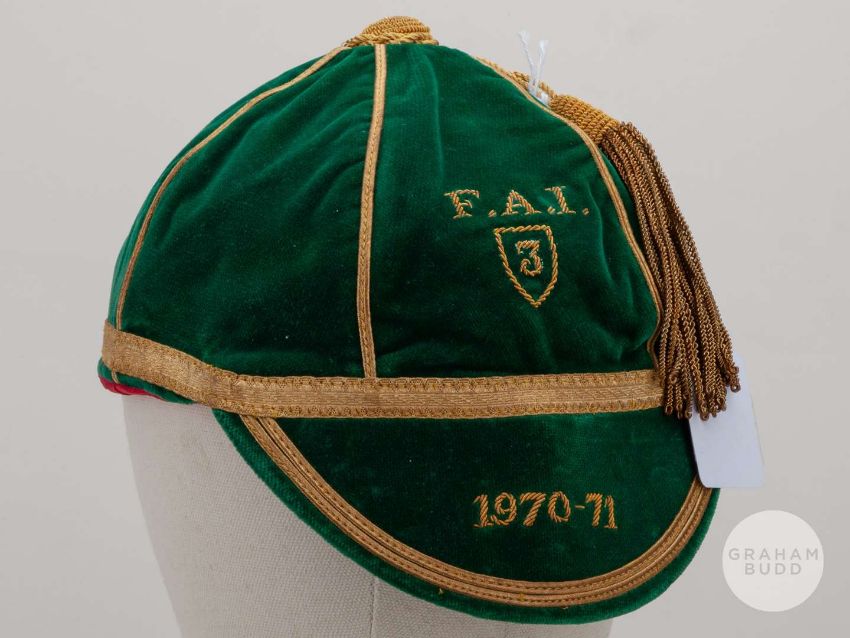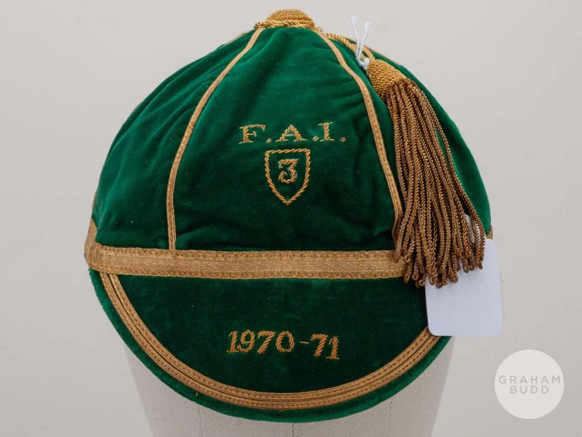Tony Dunne green Republic of Ireland v. Sweden, Italy and Austria International cap, 1970-71, the green velvet cap with gilt tassel and gilt braiding, embroidered F.A.I. 3, 1970-71.The above cap represents Dunne's 22nd, 23rd and 24th appearances for the Republic, in the Euro qualifier against Sweden played on 14th October 1970 at Dalymount Park, the teams drew the match 1-1, the Euro qualifier against Italy played on 10th May at Dalymount Park, Italy defeated Ireland 2-1 and in the Euro qualifier against Austria played on 30th May 1971 at Dalymount Park, Austria defeated Ireland 4-0.Provenance: Bonhams Sporting Memorabilia Tony Dunne Collection, 5th October 2011, Lot 211.The following lots 160 and 161 relate to the career of Republic of Ireland and Manchester United legend Tony Dunne.