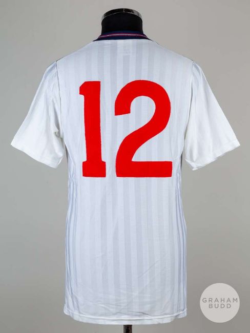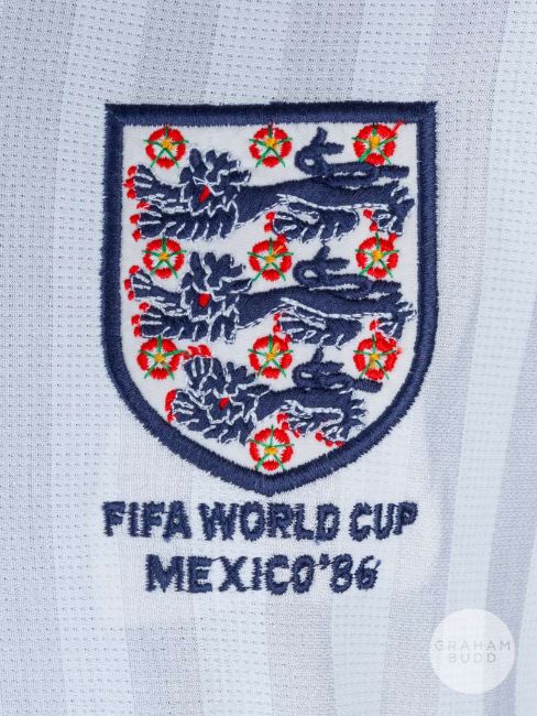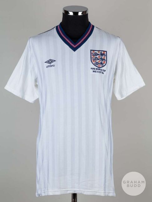 Viv Anderson white No.12 England 1986 World Cup match issued short-sleeved shirt, Mens, with v-neck collar and embroidered three lion badge inscribed FIFA WORLD CUP MEXIO '86The above shirt was issued to Viv for the 1986 World Cup Tournament, Viv was a non-playing squad memberProvenance: The Viv Anderson CollectionThe following lots 39 to 159 relate to the career of Viv Anderson MBE. See bio foot of lot 39