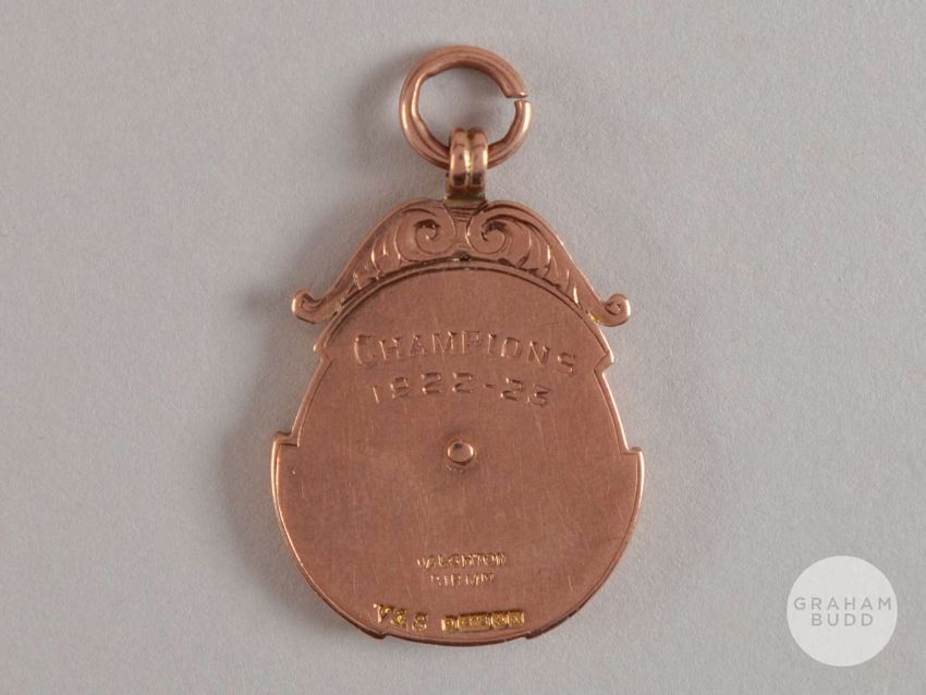 9ct gold and enamel West Lancashire Football League medal, 1922-23, the obverse inscribed WEST LANCASHIRE FOOTBALL LEAGUE, the reverse inscribed Champions 1922-23, 10grms.Accrington Stanley Reserves won the West Lancs League this season.Provenance: Knights Auctions, June 2003.