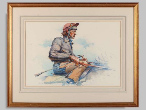 Watercolour painting of a work rider by Peter Curling (Irish, born 1955),signed, pen & ink and watercolour, titled on Tryon Gallery label pasted to the backboard, the image 33 by 49cm., mounted, framed & glazed, overall 54 by 68cm., good condition.Provenance: Lots 72 to 90. The late Richard “Dickie” Onslow, horse racing journalist, author and historian.