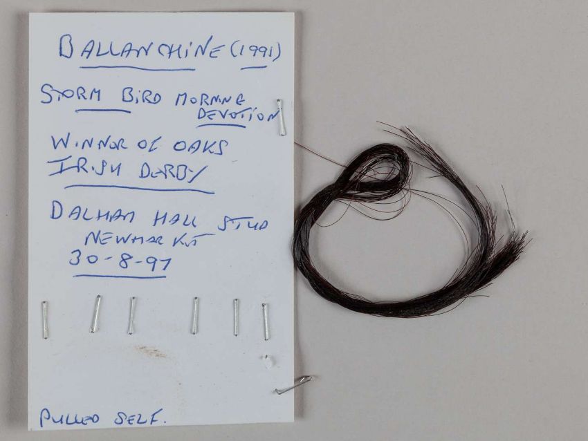 A plaited lock of hair from the racehorse and broodmare Balanchine,with a card written in the hand of the collector Ray Goddard confirming he acquired the hair at the Dalham Hall Stud, Newmarket, 30th August 1997.Provenance: The Ray Goddard Collection (lots 97 to 178). For further information on Ray Goddard and the collection see lot 144.