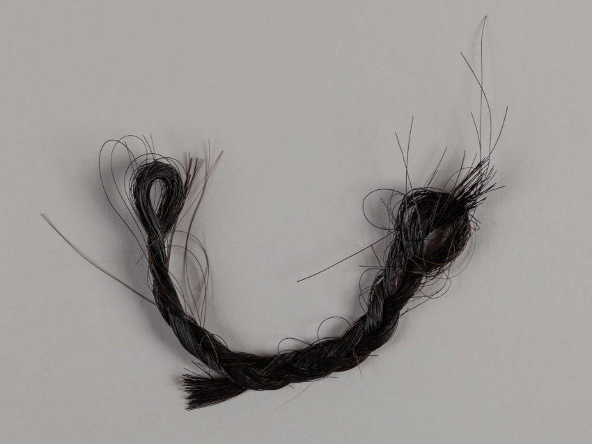 A plaited lock of hair from the racehorse and broodmare Meld,with a card written in the hand of the collector Ray Goddard confirming he acquired the hair at the Blackhall Stud, Co. Kildare, Ireland, 12th May 1976.Provenance: The Ray Goddard Collection (lots 97 to 178). For further information on Ray Goddard and the collection see lot 144.Meld was a British-bred bay filly foaled in 1952 by Alycidon out of Daily Double (Fair Trial). She was owned by Lady Zia Wernher and trained at Newmarket by Cecil Boyd-Rochfort.1n 1955 she won the Fillies’ Triple Crown with victories in the 1,000 Guineas, the Oaks and the St Leger. With two other wins including the Coronation Stakes at Royal Ascot, the filly contributed to trainer Cecil Boyd-Rochfort winning over £1million in prize money, the first time this had been achieved in Britain.At Stud, Meld most notably was the dam of the 1966 Derby winner Charllotown.Like her mother Alycidon, Meld was also chosen as a name for a British Railways “Deltic” locomotive.