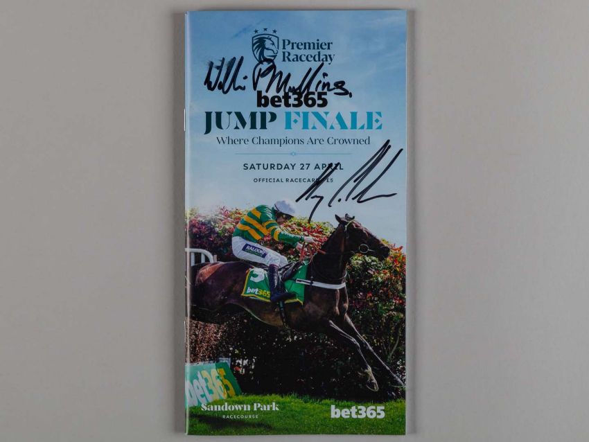 Sandown Park bet365 2023-24 Jump Finale Meeting racecard signed by the Champion Trainer and Jockey in Great Britain Willie Mullins and Harry Cobden,signatures to the front cover in black marker, very good condition.