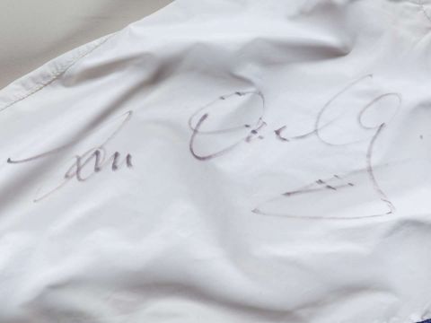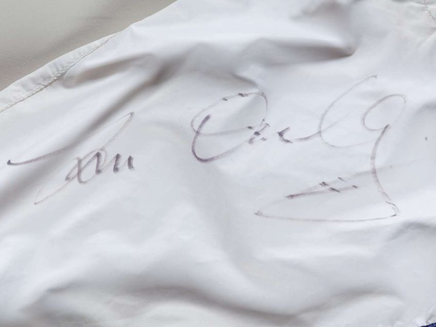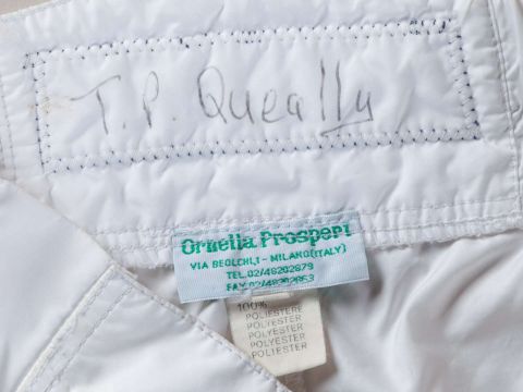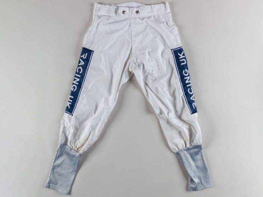 Signed Tom Queally jockey breeches worn when riding Frankel to victory in the 2010 Royal Lodge Stakes at Ascot,by Ornella Prosperi, Milano, signed to the left leg in black marker, named in ink inside back T. P. Queally, Racing UK sponsorship patches, good condition.