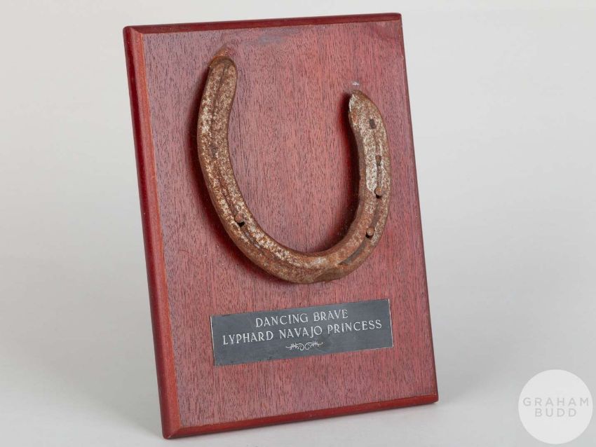Shoe worn by the racehorse Dancing Brave,mounted on a wooden plaque with easel support and set with an engraved metal plaque, 20 by 15cm.Provenance: The Ray Goddard Collection (lots 97 to 178). For further information on Ray Goddard and the collection see lot 144.Dancing Brave was an American-bred bay colt (1983) by Lyphard out of Navajo Princess (Drone). He was owned by Khalid Abdullah and trained at Pulborough by Guy Harwood.The colt was the outstanding European racehorse of 1986.The win in the Prix de l'Arc de Triomphe was his fourth G1 victory, having previously won the 2,000 Guineas, the Eclipse Stakes and the King George VI and Queen Elizabeth Diamond Stakes. In the Derby he was ridden by Greville Starkey who was widely criticised for his ride when beaten 1/2l by Shahrastani. By Timeform ratings, Dancing Brave (140) is amongst the top ten thoroughbreds since their records began.At Stud, Dancing Brave sired the 1993 Epsom and Irish Derby winner Commander In Chief; before being exported to Japan to continue his stallion duties.