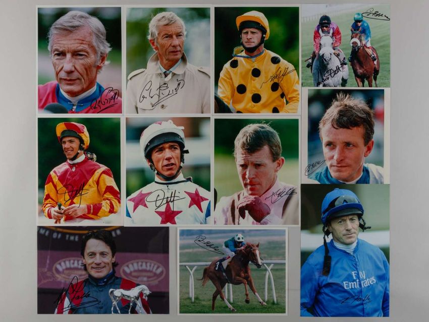 11 signed photographs of leading flat race jockeys,mostly 10 by 8in., all colour press photographs, comprising: two portraits of Lester Piggott, Frankie Dettori, Mick Kinane and Kieren Fallon; a portrait and an action shot of Pat Eddery (winning the Fred Darling on Musicale); and an action photograph double-signed by Frankie Dettori and Pat Eddery (Frankie winning on the Queen's horse Arabian Story), good condition, (11).