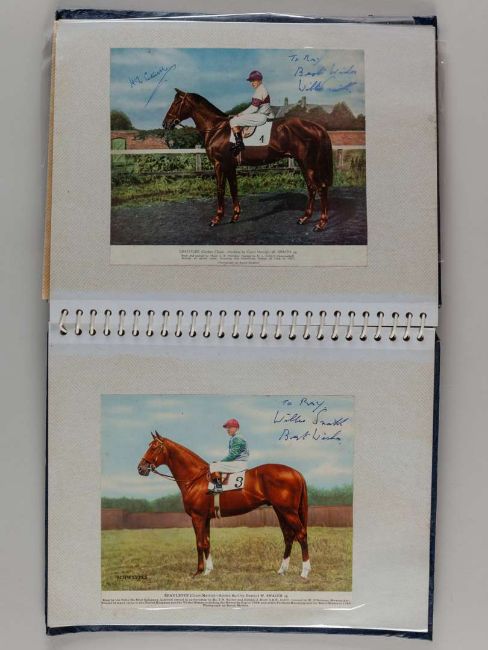 Horse racing autographs from the Ray Goddard Collection, all collected on Schweppes Calendar pages signed by Arthur Budgett, Greville Starkey x 3, John Dunlop & Greville Starkey double-signed, Willie Snaith & Harry Cottrill double-signed, Tom Dreaper & Pat Taaffe double-signed, Fulke Walwyn x 3, Sir Gordon Richards x 3, Pat Taaffe x 4, Fred Winter x 10 Doug Smith x 2, Capt. Tim Forster & Graham Thorner double-signed, Peter Walwyn x 8, Tommy Stack, Keith Piggott and Jack Jarvis, some laid down in albums, some in loose form, (a lot).Provenance: The Ray Goddard Collection (lots 97 to 178). For further information on Ray Goddard and the collection see lot 144.
