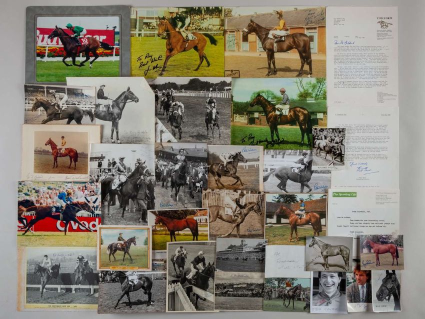 Horse racing autographs from the Ray Goddard Collection, mostly autographed on press photographs & magazine plates, occasional signed correspondence and other miscellaneous items, signatures comprising Doug Smith x 2, Pat Taaffe, Sir Gordon Richards, Charlie Elliott x 2, Martin Molony x 3, Peter Walwyn x 8, Jimmy Lindley, Phil Bull, Tommy Weston, Joe Mercer x 2, Lester Piggott & Geoff Wragg double-signed, Anne Duchess of Westminster, John Oxx & Johnny Murtagh double-signed, Michael Stoute & Kieren Fallon double-signed, John McCririck, Paddy Prendergast, Ben Hanbury & Ray Cochrane double-signed, Ginger McCain, Steve Cauthen and John Francome, (a lot).Provenance: The Ray Goddard Collection (lots 97 to 178). For further information on Ray Goddard and the collection see lot 144.