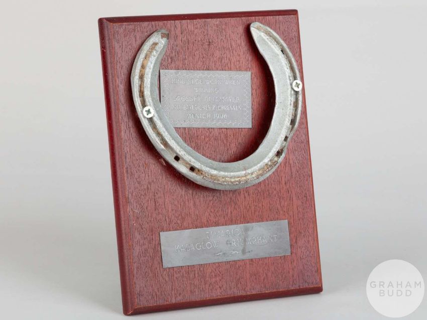 Shoe worn by the racehorse Timarida when winning the Grosser Dullmayer Prix Bayeriches Zuchrennen at Munich in 1996,mounted on a wooden plaque with easel support and set with engraved metal plaques, 20 by 15cm.Provenance: The Ray Goddard Collection (lots 97 to 178). For further information on Ray Goddard and the collection see lot 144.Timarida was a grey filly foaled in 1992 by Kalaglow out of Triumphant (Track Spare). She was bred and raced by H.H. The Aga Khan and trained in Ireland by John Oxx.Unraced as a 2-y-o, the filly was raced internationally at three and four and recorded 10 victories including the Grosser Dullmayer Prix Bayeriches Zuchrennen, the occasion she wore this shoe. Other notable victories were recorded in the Brownstown Stakes, Matron Stakes, Prix de l’Opera, E P Taylor Stakes, Beverly D Stakes and Irish Champion Stakes.At Stud, of her seven foals the best was Timarwa who won the fillies & mares Group race now known as the Snow Fairy Stakes at The Curragh, previously sponsored by the Lanwades Stud.