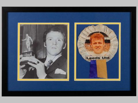Billy Bremner display comprising signed photo of him holding the PFA 1970 player of the year trophy mounted alongside an original 1970's rosette, framed and glazed, 13 x 19in.