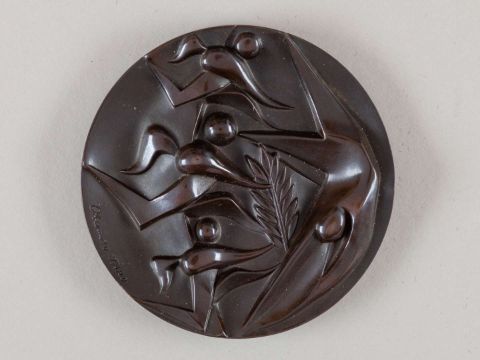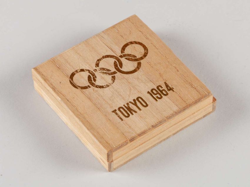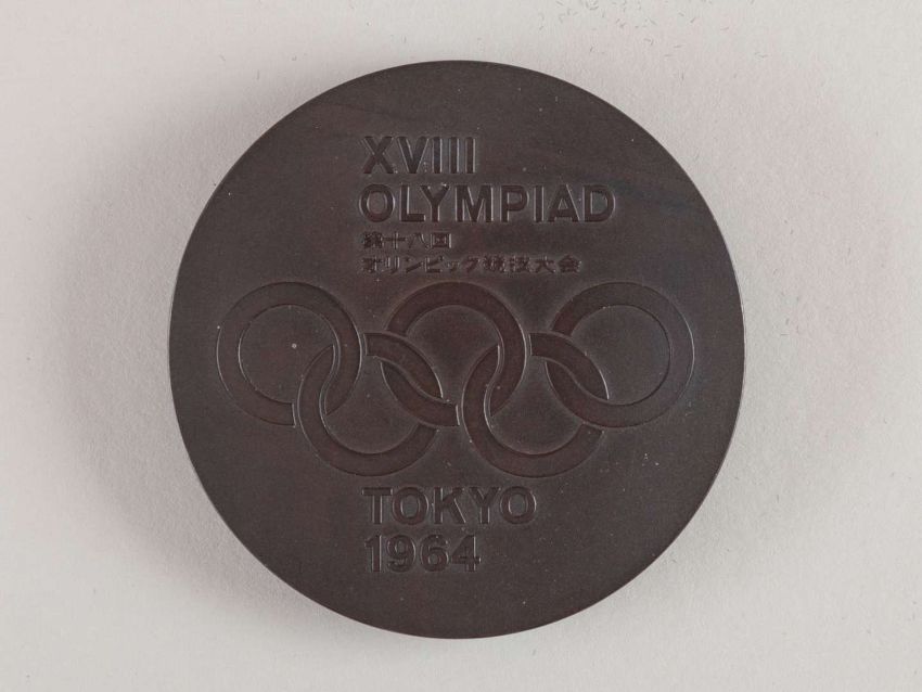 Tokyo 1964 Olympic Games participant's medal, designed by T. Okamoto and K. Tanaka, copper, the obverse with stylised figures of  three runners and a swimmer, inscribed OKAMOTO TANAKA, the reverse with Olympic Rings and legend in Japanese and English, inscribed XVIII OLYMPIAD TOKYO 1964, rim bearing mint stamp, in original box, diameter 61mm.